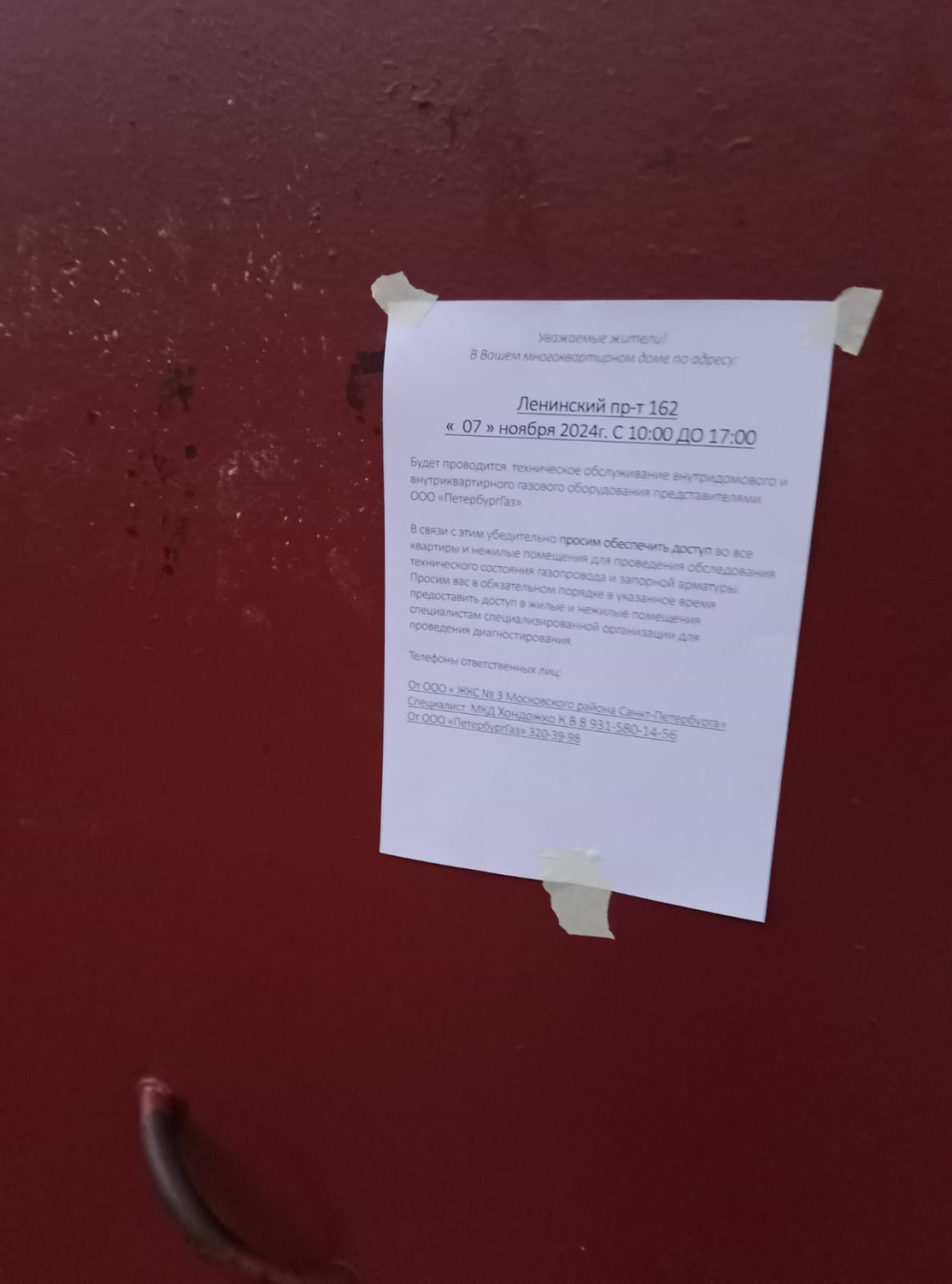 Информирование собственников о необходимости предоставления доступа в квартиры для проверки внутридомового и внутриквартирного газового оборудования сотрудниками ООО "ПетербургГаз" в многоквартирном доме по адресу: Ленинский проспект, д. 162