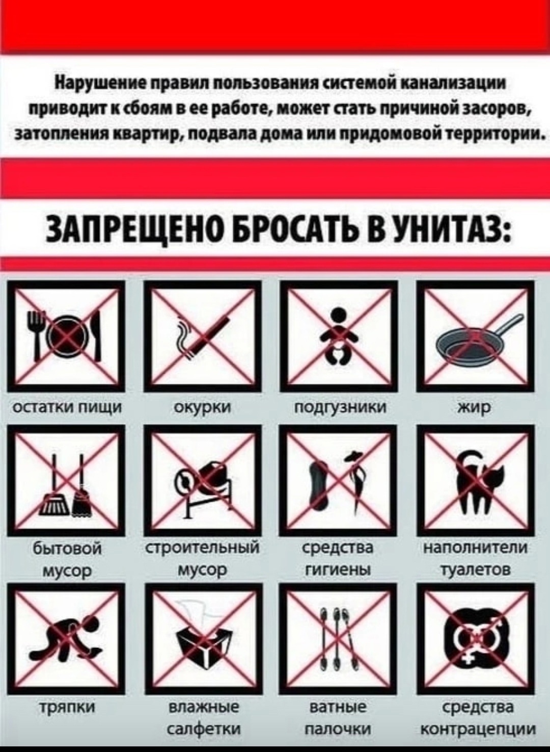 Запрещено бросать в унитазы и раковины песок, строительный мусор, сухие и разведённые строительные смеси и их остатки, тряпки, предметы личной гигиены (кроме туалетной бумаги), кости, стекло, металлические и деревянные предметы, а также наполнители для туалетов животных.