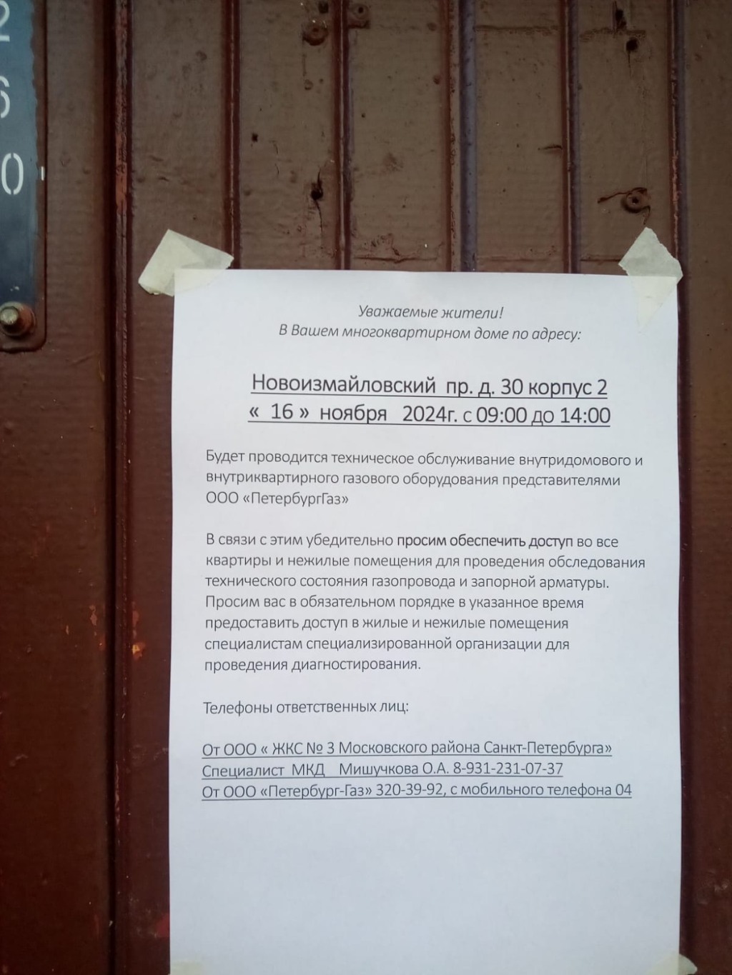 Информирование собственников о необходимости предоставления доступа в квартиры для проверки внутридомового и внутриквартирного газового оборудования сотрудниками ООО "УниверсалГазСервис" в многоквартирном доме по адресу: Новоизмайловский проспект, д. 30, к. 2