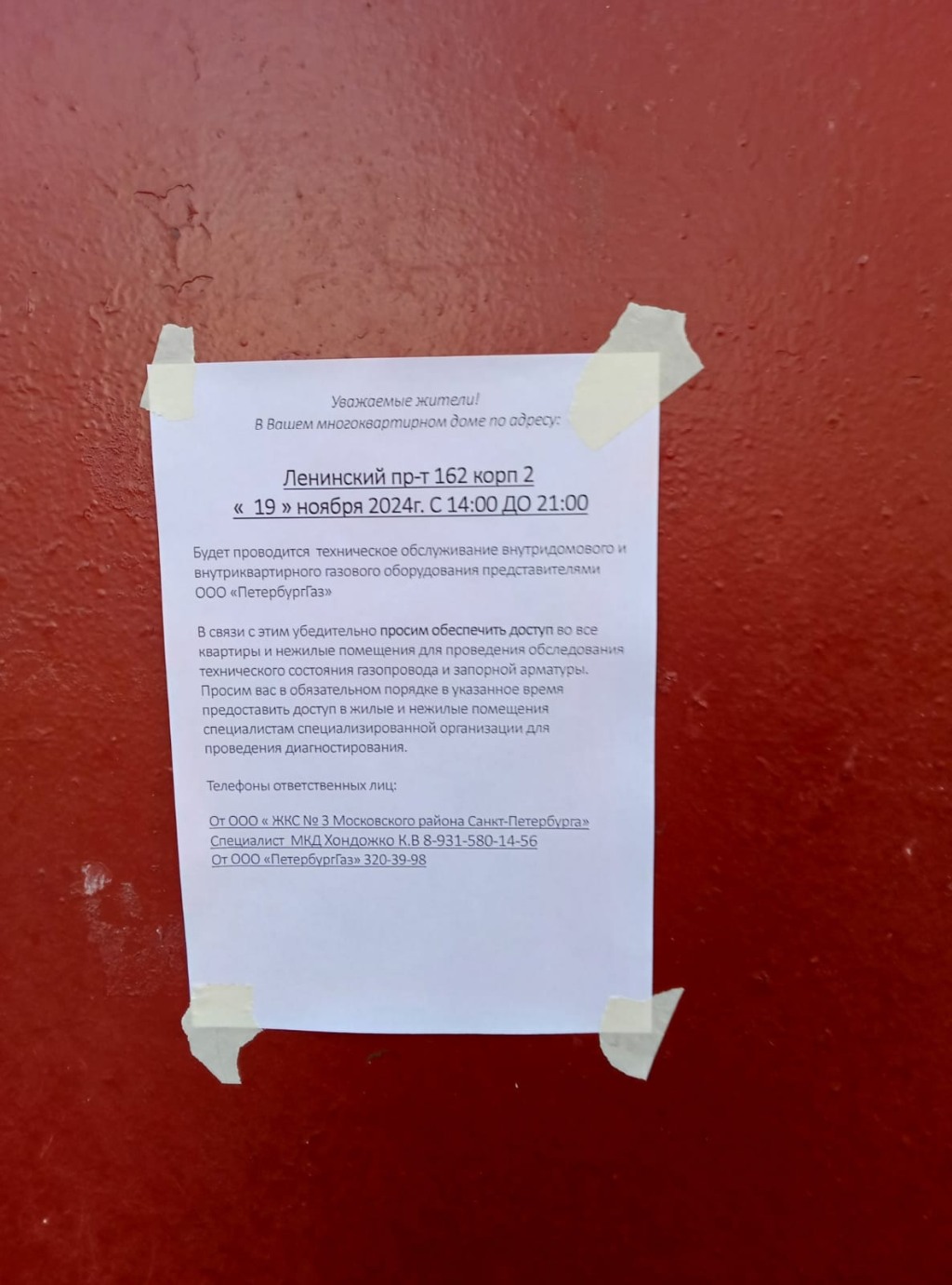Информирование собственников о необходимости предоставления доступа в квартиры для проверки внутридомового и внутриквартирного газового оборудования сотрудниками ООО "ПетербургГаз" в многоквартирном доме по адресу: Ленинский проспект, д. 162, к. 2