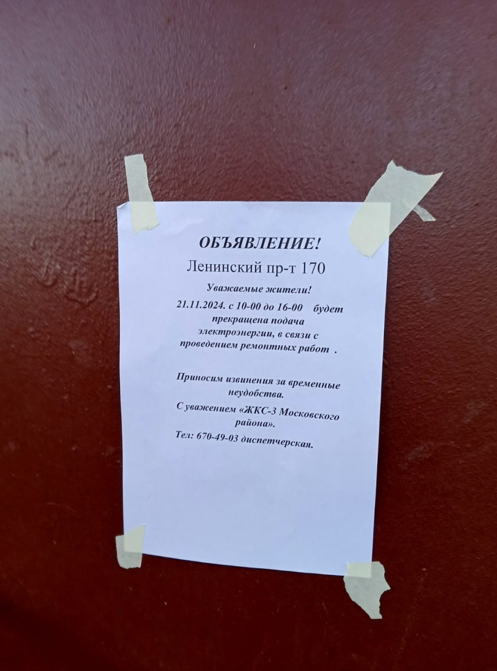 Информирование собственников об отключении электроэнергии с 10:00 до 16:00 21.11.2024 г. в связи с ремонтными работами на ГРЩ многоквартирного дома по адресу: Ленинский проспект, д. 170