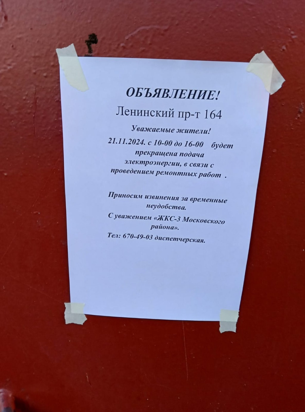 Информирование собственников об отключении электроэнергии с 10:00 до 16:00 21.11.2024 г. в связи с ремонтными работами на ГРЩ многоквартирного дома по адресу: Ленинский проспект, д. 164