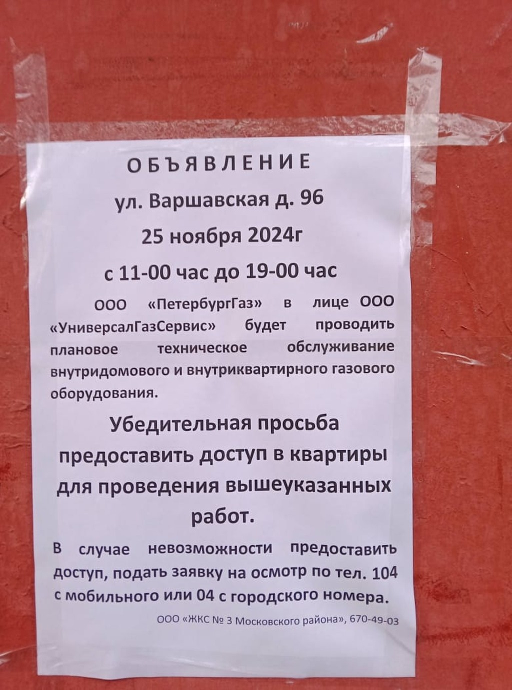 Информирование собственников о необходимости предоставления доступа в квартиры для обслуживания внутридомового и внутриквартирного газового оборудования сотрудниками ООО "УниверсалГазСервис" в многоквартирном доме по адресу: Варшавская улица, д. 96