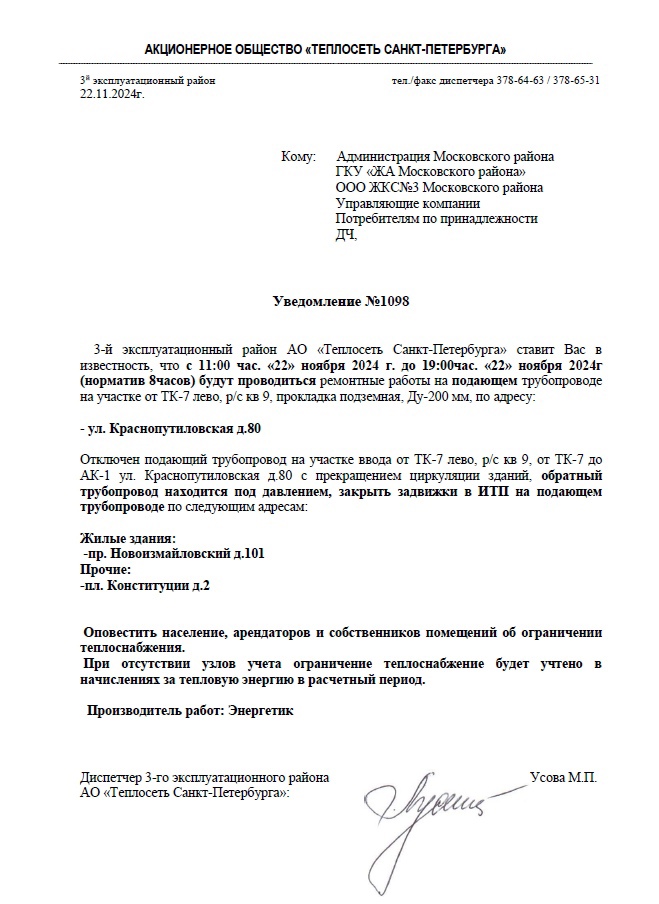 3-й эксплуатационный район АО «Теплосеть Санкт-Петербурга» ставит Вас в известность, что с 11:00 час. «22» ноября 2024 г. до 19:00 час. «22» ноября 2024г (норматив 8 часов) будут проводиться ремонтные работы на подающем трубопроводе по адресу: