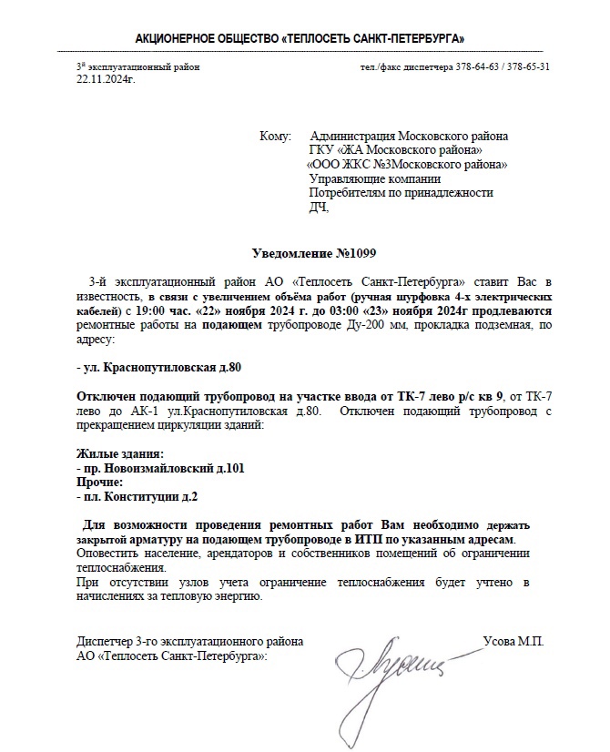 3-й эксплуатационный район АО «Теплосеть Санкт-Петербурга» ставит Вас в известность, в связи с увеличением объёма работ (ручная шурфовка 4-х электрических кабелей) с 19:00 час. «22» ноября 2024 г. до 03:00 «23» ноября 2024г продлеваются ремонтные работы на подающем, по адресу: