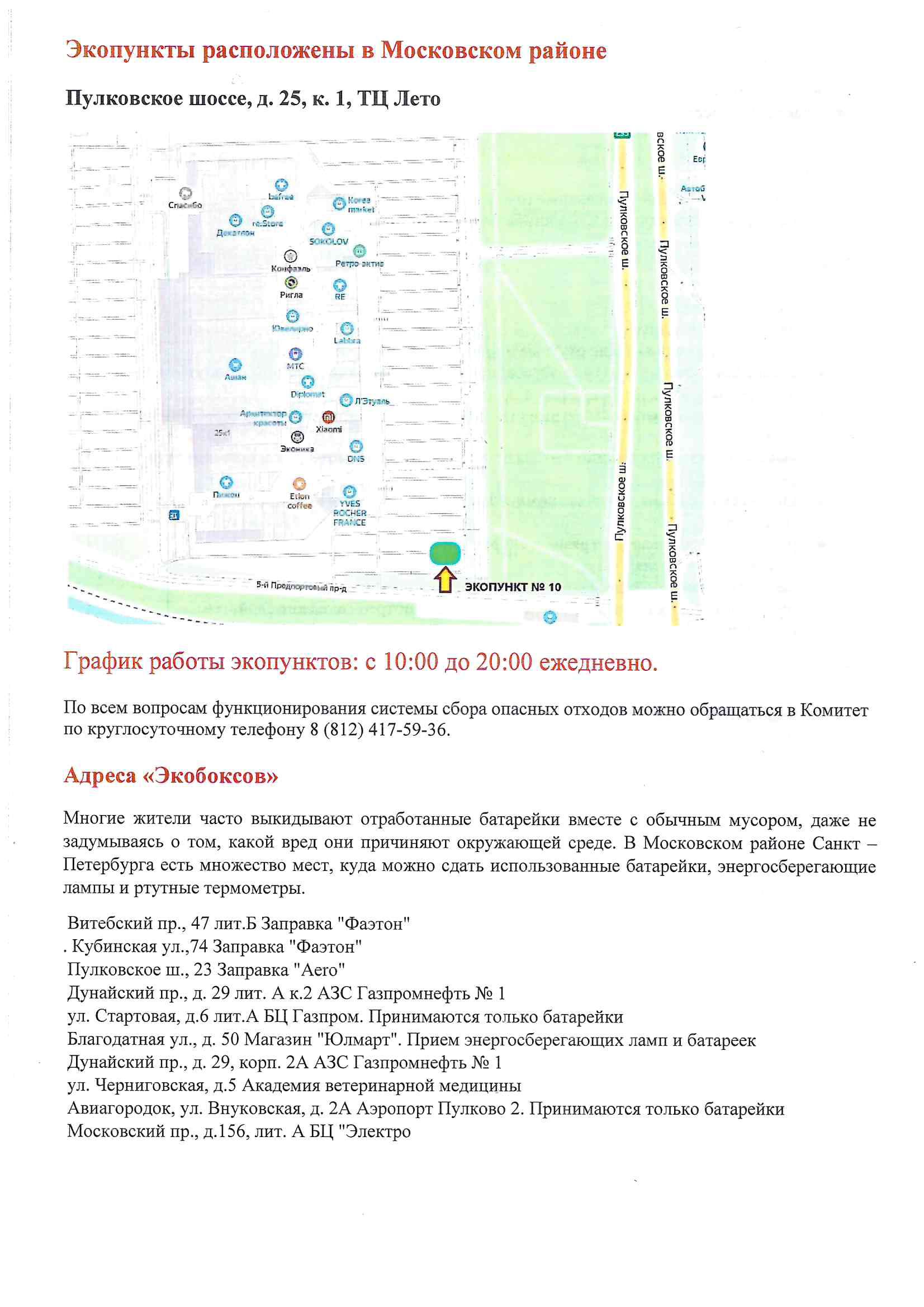 Места расположения "Экопунктов" и "Экобокосов" в Московском районе